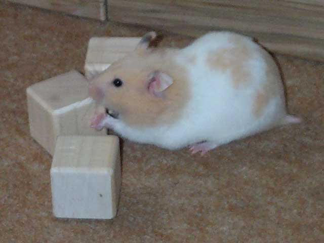On Friday the 13th of April, I also built Ruffles a big run to play in. I built it out of wooden blocks, so in the end we had to knock it down. It had lots of obstacles in it made out of wood, and she did go on the ramp and through the plastic tube, but she gnawed most of the other bricks. She worked out that if she put her paws on top of the bricks she could pull herself up and escape, but luckily we were too fast for her. She also kept chewing at the carpet, and Jon kept on knocking the bricks over which didn't help! Correct me if I'm wrong but isn't Friday the 13th supposed to be an unlucky day, well it was a lucky day for Ruffles then!