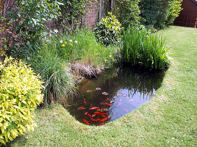 It's late May and we've had our first (and hopefully not last!) taste of summer. The plants around the pond are now growing like billy-o and the filter box has disappeared behind a mass of grass and fern. With this lush growth comes the annual problem of Thomas deciding that it makes a nice place to sleep - squashing the grass in the process. An ultrasonic cat scarer is now keeping guard... The plant growth outside the pond is matched by that in the water; the lily now has leaves on the surface with a flower on the way up, and the elodea (Canadian pond weed) replanted in March is now thick and bushy.On the maintenance side, pump cleaning is down to every 2-3 weeks and a bag of barley straw seems to be keeping the silk weed under control.