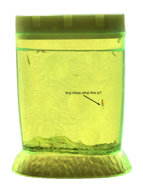 Cats - Aquarium - Pond - Hamster Sea Monkeys Yes, these "instant pets" really do exist. Dan got them as a Christmas present and they come as dried eggs. In a process known as cryptobiosis, the eggs come to life when added to water. Currently the Sea Monkeys (actually a kind of shrimp related to brine shrimps and daphnia - their long "tails" were thought to make them look like monkeys) are 12 weeks old and about 1cm long. Over the past couple of weeks the Sea Monkeys have been changing: the "backbone" that first appeared in them at 9 weeks is now clearly a body, and some are turning pink as their bodies become thicker. More strangely, some have developed mysterious bulges in their bodies and others are pairing up and swimming around in twosomes. Are these facts connected? Is Spring in the air? Anyway, click on the following photo to see an enlargement of the Sea Monkeys living in their very tasteful lime-green tank.