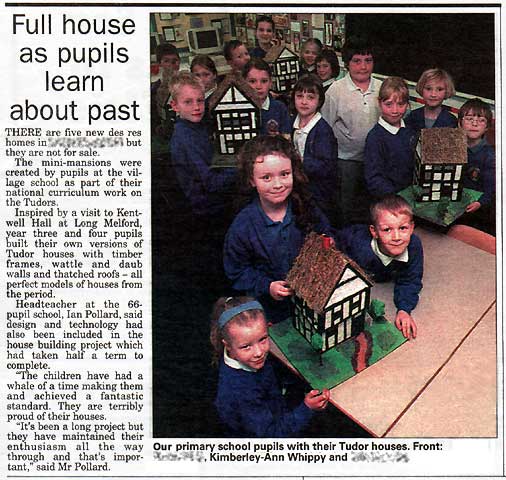 Full house as pupils learn about past There are five new des-res homes in our village but they are not for sale. The mini-mansions were created by pupils at the village school as part of their national curriculum work on the Tudors. Inspired by a visit to Kentwell Hall at Long Melford, year three and four pupils build their own versions of Tudor houses with timber frames, wattle and daub walls and thatched roofs - all perfect models of houses from the period. Headteacher at the 66-pupil school, Ian Pollard, said design and technology had also been included in the house building project which had taken half a term to complete. "The children have had a whale of a time making them and achieved a fantastic standard. They are terribly proud of their houses. "It's been a long project but they have maintained their enthusiasm all the way through and that's important" said Mr Pollard. |
